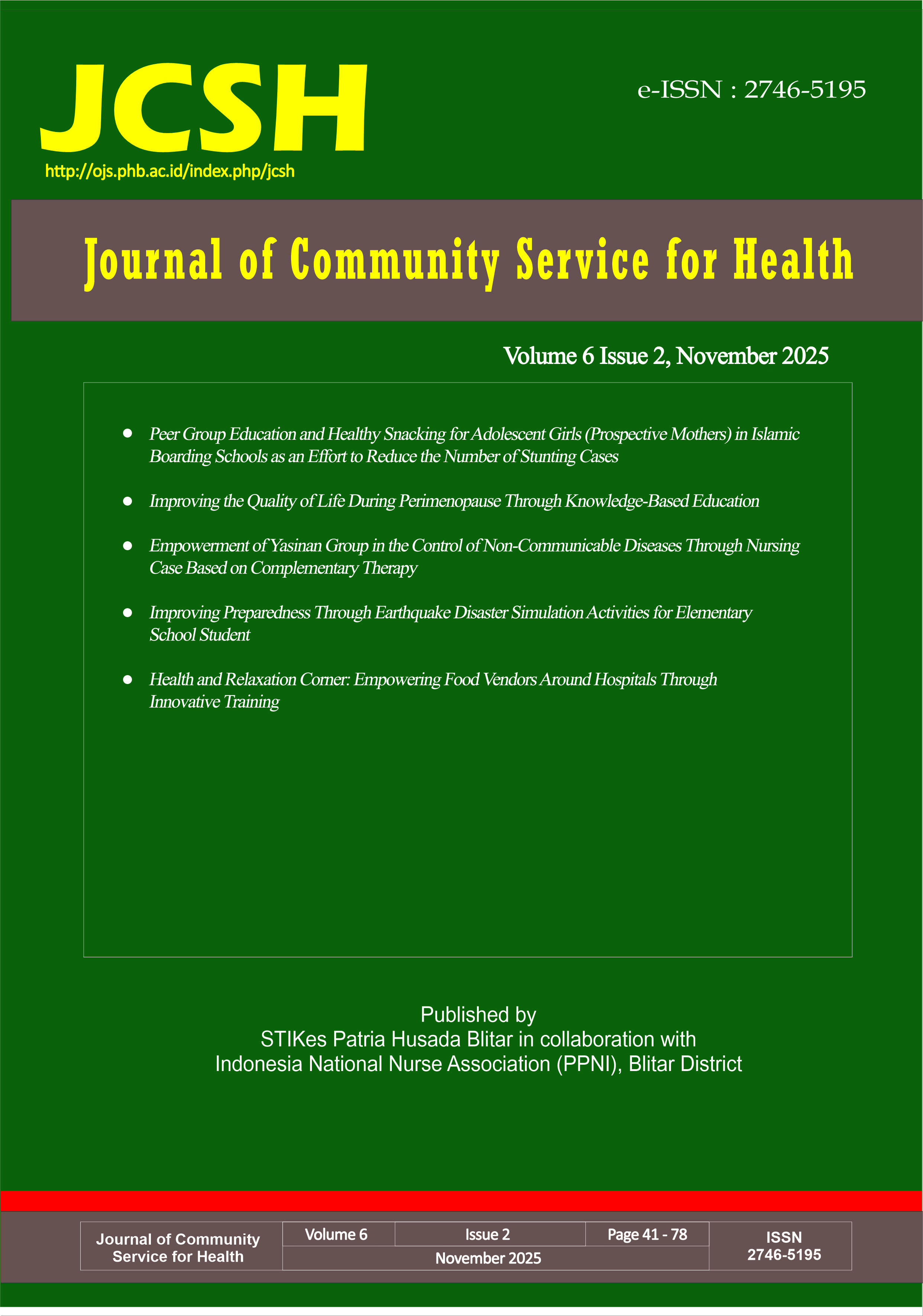 Journal of Community Services for Health published by STIKes Patria Husada Blitar. JCSH is Published semi-annually (May and November). JCSH only receive original manuscripts related to community service and have not been published in domestic or foreign journals. The content of the manuscripts can be the results of community service conducted by lecturers or public servants based on their competence. The manuscript is written in English in the form of narrative with an effective and academic language style. The manuscript should be arranged systematically.
